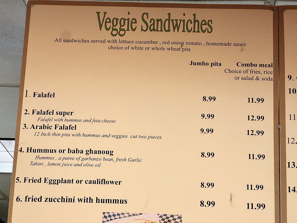 Indulge in a delightful crunch with our fried zucchini sandwich, featuring crispy zucchini tucked within a warm pita bread, paired with a medley of fresh lettuce, cucumber, red onion, tomato, and our signature homemade sauce. Served with your choice of white or whole wheat pita for a satisfying fusion of flavors and textures.